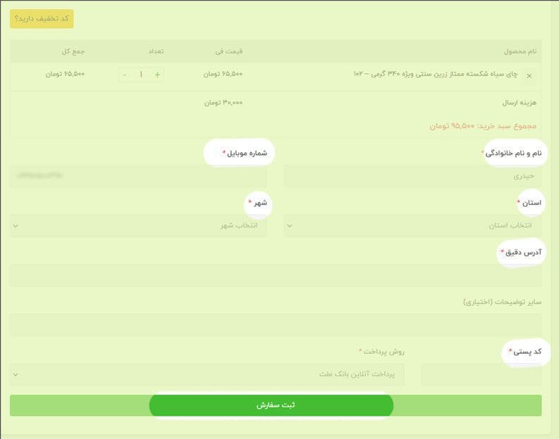 در این مرحله از خرید آنلاین چای باید اطلاعات خود همچون نام و شماره همراه و آدرس و کد پستی و در صورت داشتن کد تخفیف آن را وارد کنید و دکمه ثبت سفارش را انتخاب کنید.
