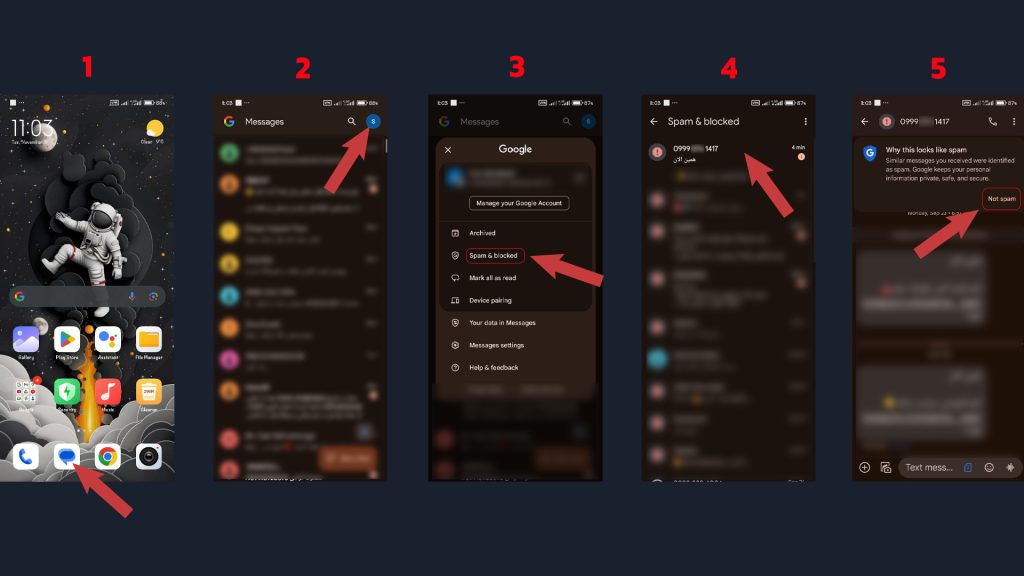 با کلیک روی این گزینه شماره پیامکی از حالت اسپم خارج می شود.